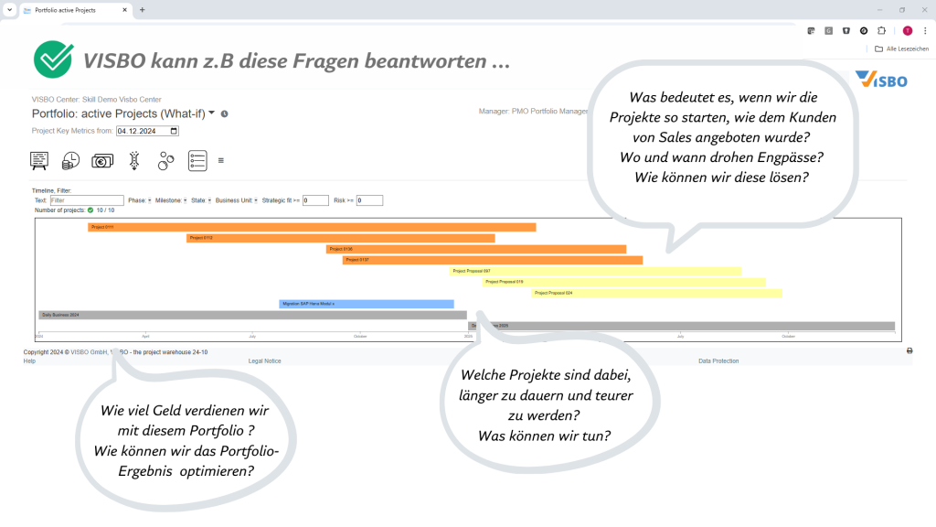 Die VISBO KI unterstützt bei der Neu-Anlage von neuen Projekten, dem überlastungsfreien Staffeln von Projekten, beim Auflösen von drohenden Ressourcen Engpässen, dem automatisierten Erstellen von Projekt und Portfolio Kennzahlen, dem Erstellen und Aktualisieren von Powerpoint Reports und dem Übernehmen von Daten aus verschiedenen Systemen wie HR, ERP oder eingesetzten Detail-Planungs-Systemen.